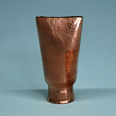 工業製品を主題にしつつ、その下部を切り取り一輪挿しにも使えそうな形態に仕上げるなど、新鮮な魅力に溢れています。とは言え、単にユニークなだけではなく、素材と鍛金の魅力を最大限に伝えようとする作家の意気込みも感じられます。(藤田裕彦 評)