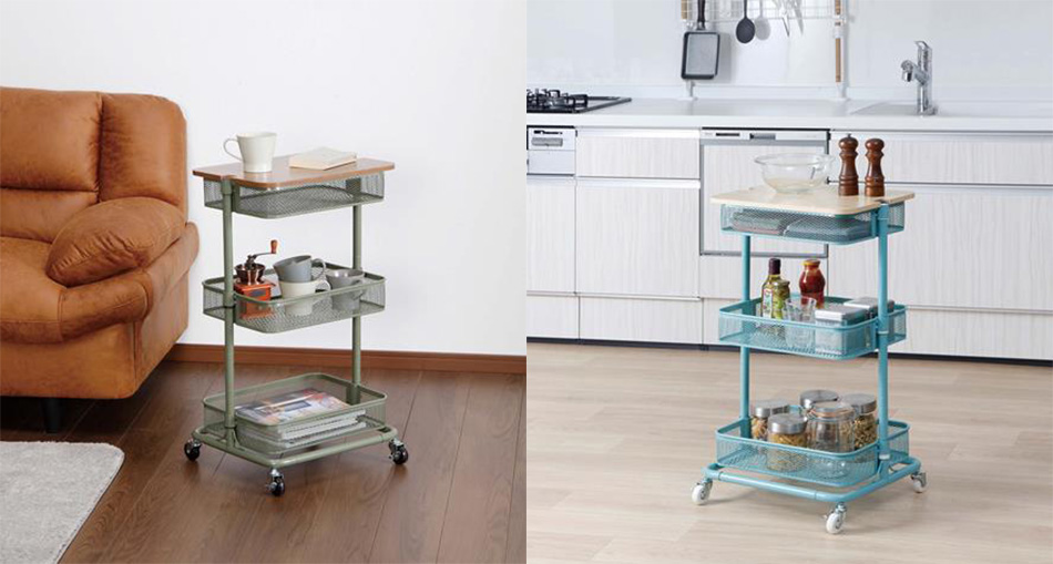 当社が2018年より販売を開始いたしましたメッシュバスケットワゴン(天板付)は、お客様から非常に好評をいただいておりました。そこで、これまで発売しておりましたホワイト、ブラックとネイビーブルーに加えて、インテリアにもなじみやすいカーキ、ターコイズブルーを新たにデビューさせました。淡いパステルカラーなのでお部屋になじみやすく、雰囲気に合わせてお使いいただけます。