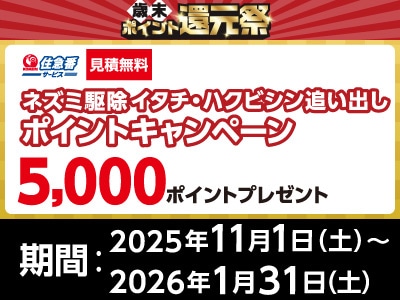 期間中、ネズミ駆除・イタチ・ハクビシン追い出しサービスをご注文いただくと、もれなく5,000ポイントプレゼント。